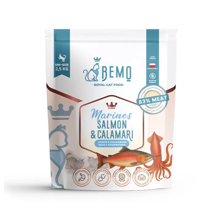 to monoproteinowa karma super premium polskiej marki Bemo dla dorosłych kotów, oparta na wysokiej jakości mięsie łososia z dodatkiem kalmarów. Formuła całkowicie wolna od kurczaka, zbóż, grochu i soi, wzbogacona o olej rybny, prebiotyki i kompleks dla stawów. Zapewnia kompleksowe wsparcie skóry, sierści, trawienia i odporności, będąc idealnym wyborem dla alergików i wybrednych mruczków.