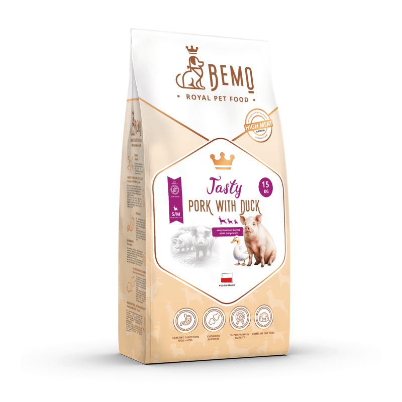 Bemo Tasty to kompletna formuła z udziałem dwóch wyjątkowych rodzajów mięs – wysoce odżywczego mięsa z kaczki wraz z wybitnie smakowitym mięsem wieprzowym. Karma super premium  stworzona na bazie mięsa z wieprzowego i kaczego, i z dodatkiem polskich owoców i warzyw oraz prozdrowotnych nutraceutyków takich jak: substancje humusowe, MOS, FOS i taniny, dostarcza substancji odżywczych wspierających równowagę metaboliczną w organizmie i regulujących procesy trawienne.