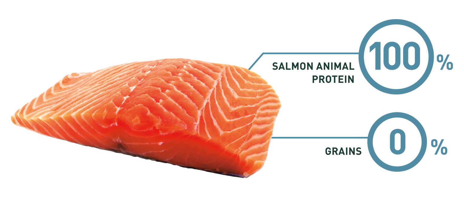 Suszony łosoś, tapioka, zielony groszek, hydrolizowane białko łososia, białko ziemniaczane, tłuszcz drobiowy (źródło kwasów tłuszczowych Ω-6), drożdże i ekstrakt drożdżowy – Saccharomyces cerevisiae (źródło mannanooligosacharydów – MOS i β-glukanów), naturalna celuloza (źródło nierozpuszczalnego błonnika), bataty, wysłodki buraczane, chleb świętojański, olej z łososia (źródło kwasów tłuszczowych Ω-3-EPA i DHA), minerały, inulina (rozpuszczalny błonnik pokarmowy z korzenia cykorii, źródło frukto-oligosacharydów – FOS), rozpuszczalny błonnik pokarmowy uzyskany z Plantago ovata, olejki eteryczne (oregano, cynamon, goździk, tymianek, rozmaryn, mięta pieprzowa, zielona herbata), juka, hydrolizaty skorupiaków (źródło glukozaminy), hydrolizaty kolagenu (źródło chondroityny), koncentrat liofilizowanego soku z melona (bogaty w dysmutazę ponadtlenkową – SOD).