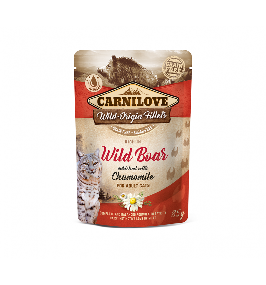to bezzbożowa, mokra karma dla dorosłych kotów w formie filetów w sosie. Zawiera 85% mięsa (kurczak i dzik) z dodatkiem rumianku. Receptura wspiera mięśnie, trawienie i zdrowie jamy ustnej, nie zawiera zbóż, ziemniaków, GMO ani sztucznych dodatków.