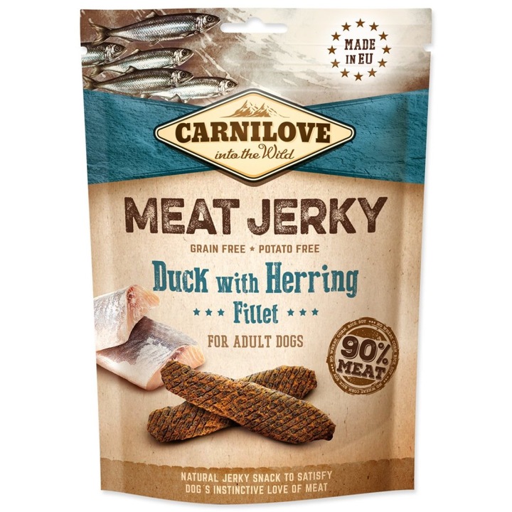 CARNILOVE JERKY Duck with Herring Fillet to smakowity baton proteinowy stworzony specjalnie dla psów, zawierający wysokiej jakości kaczkę i filet ze śledzia.