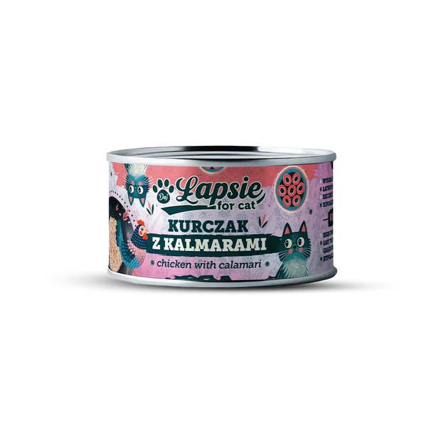 Łapsie for cat – Kurczak w bulionie z kalmarem to naturalna, pełnoporcjowa, mokra karma dla dorosłych kotów, łącząca soczystą pierś z kurczaka (46%) z wykwintnym dodatkiem kalmarów (4%) w aromatycznym bulionie. Bezzbożowa receptura bez sztucznych dodatków, wzbogacona o taurynę, zapewnia kompletną dietę nawet dla wybrednych kotów i tych o wrażliwym układzie pokarmowym. Karma klasy Human Grade.