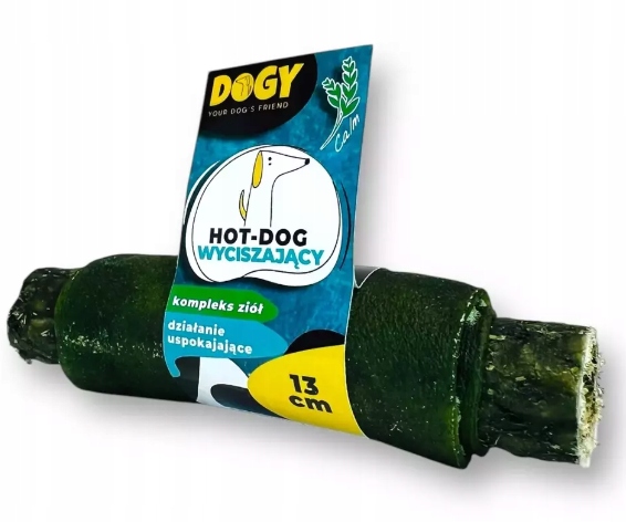 Hot-Dog DOGY Calm to gryzak, który swoim kształtem przypomina klasycznego hot-doga – doskonale nadaje się do zabawy i długotrwałego żucia. Ten unikalny przysmak składa się z palucha wykonanego ze zmielonej skóry z dodatkiem melisy i rumianku, otoczonego owijką ze skóry wołowej, również wzbogaconą ziołami.