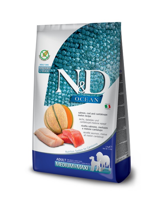 Farmina N&D Ocean Medium & Maxi to wysokiej jakości bezzbożowa karma stworzona z myślą o potrzebach żywieniowych psów ras średnich i dużych. Jej głównym składnikiem są ryby morskie (takie jak dorsz, śledź czy łosoś), które dostarczają lekkostrawnego białka i cennych kwasów tłuszczowych omega-3 i omega-6 – wspierających zdrową skórę, lśniącą sierść oraz pracę serca i układu nerwowego.