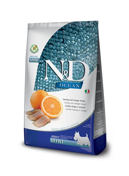 Farmina N&D Ocean Mini Adult to pełnoporcjowa, bezzbożowa karma klasy super premium stworzona specjalnie dla psów dorosłych małych ras. Jej formuła oparta jest na wysokiej jakości rybach morskich (np. dorsz, łosoś, śledź), które są doskonałym źródłem lekkostrawnego białka oraz kwasów omega-3 i omega-6. Dzięki temu karma wspiera zdrową skórę, lśniącą sierść, układ odpornościowy oraz sercowo-naczyniowy.