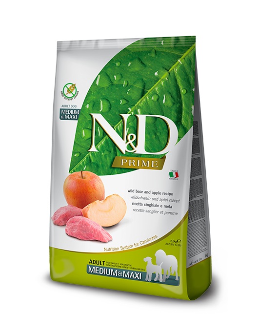 Farmina N&D Prime Medium & Maxi to pełnoporcjowa, bezzbożowa karma klasy super premium, stworzona dla psów dorosłych ras średnich i dużych. Jej receptura oparta jest na wysokiej zawartości świeżego mięsa (kurczak, jagnięcina, dzik) oraz dodatkach roślinnych wspierających trawienie, odporność i zdrowie metaboliczne.