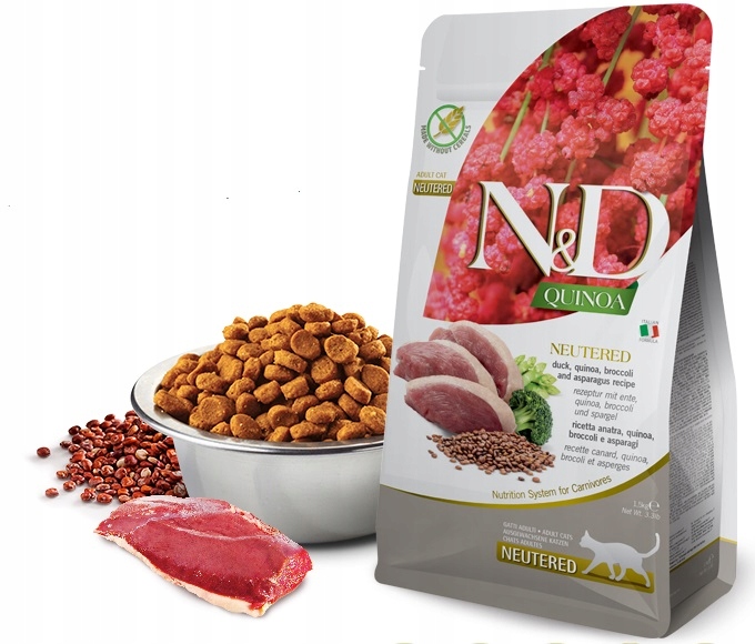 N&D Quinoa Neutered to specjalna karma stworzona z myślą o kotach, które mają szczególne potrzeby żywieniowe – na przykład są po kastracji, żyją w domu lub wymagają wsparcia zdrowotnego. Zawiera aż 91% białka pochodzącego z mięsa wysokiej jakości, co wspiera dobre zdrowie i prawidłowe funkcjonowanie organizmu.