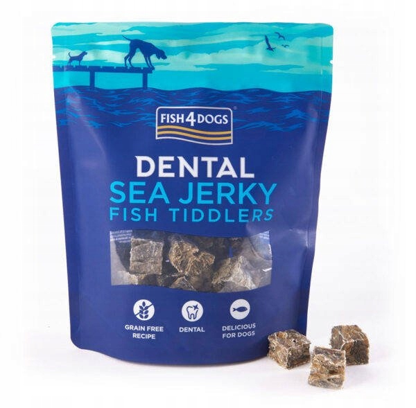 Fish4Dogs Sea Jerky Fish Tiddlers skóra rybna 115g Przysmaki Fish4Dogs to niskokaloryczne i lekkostrawne przysmaki dla psa zawierające jedynie naturalny składnik jakim jest naturalna, suszona skóra rybia. Podając psu rybi przysmak dostarczasz mu cennych kwasów Omega, które korzystnie wpływają na układ odpornościowy oraz wygląd skóry i sierści. Przysmaki dentystyczne Sea Jerky są twarde, a rybia skóra ma chropowatą strukturę co pomaga usuwać kamień nazębny. Twój pies gryząc przysmaki Fish4Dogs dba o zdrowie i higienę jamy ustnej jednocześnie nie obciążając żołądka. Dodatkowo przysmaki obłędnie pachną i są idealnym źródłem białka dla psów borykających się z alergią pokarmową.
