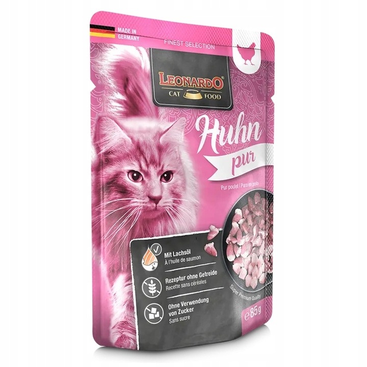 Leonardo mokra karma dla kotów w saszetce 85g, to wysokiej jakości karma przeznaczona dla dorosłych kotów, zawierająca świeże mięso, które jest gotowane na parze, zachowując ich naturalne wartości odżywcze. Karma wzbogacona jest o olej z łososia, który dostarcza wielonienasyconych kwasów tłuszczowych i minerałów, a także zawiera taurynę.