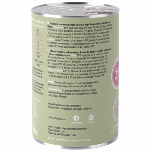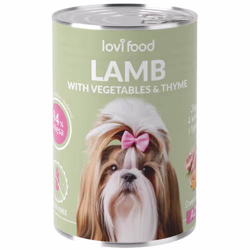 Lovi Food Lamb with Vegetables & Thyme to monobiałkowa, mokra karma super premium, stworzona z myślą o zdrowiu, witalności i doskonałym wyglądzie dorosłych psów wszystkich ras. Receptura oparta na delikatnej jagnięcinie (94% zawartości mięsa i podrobów), wzbogacona o funkcjonalne warzywa, zioła i suplementy, dostarcza kompletnego, lekkostrawnego posiłku pozbawionego zbóż, kurczaka i sztucznych dodatków.