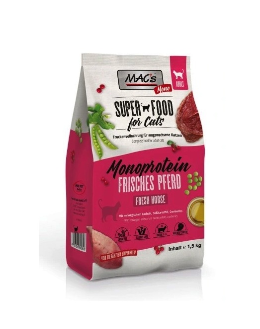 Bezzbożowa karma monoproteinowa dla dorosłych kotów Idealne rozwiązanie dla Twojego wrażliwego kota! 🌟 Czy Twój kot cierpi na alergie pokarmowe lub ma wrażliwy żołądek? MAC’s Cat Adult Monoprotein Konina to specjalistyczna karma stworzona z myślą o kotach wymagających szczególnej troski i diety eliminacyjnej. Daj swojemu pupilowi to, co najlepsze! ❤️