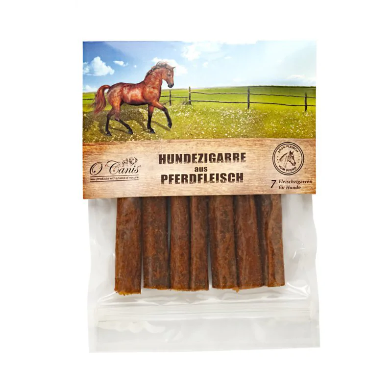 O’Canis Cygara to wyjątkowe, naturalne przysmaki mięsne dla psów, stworzone z wysokiej jakości mięsa (w zależności od wariantu: np. koń, dziczyzna, wołowina) i formowane w kształt cygar. W opakowaniu znajduje się 7 sztuk.