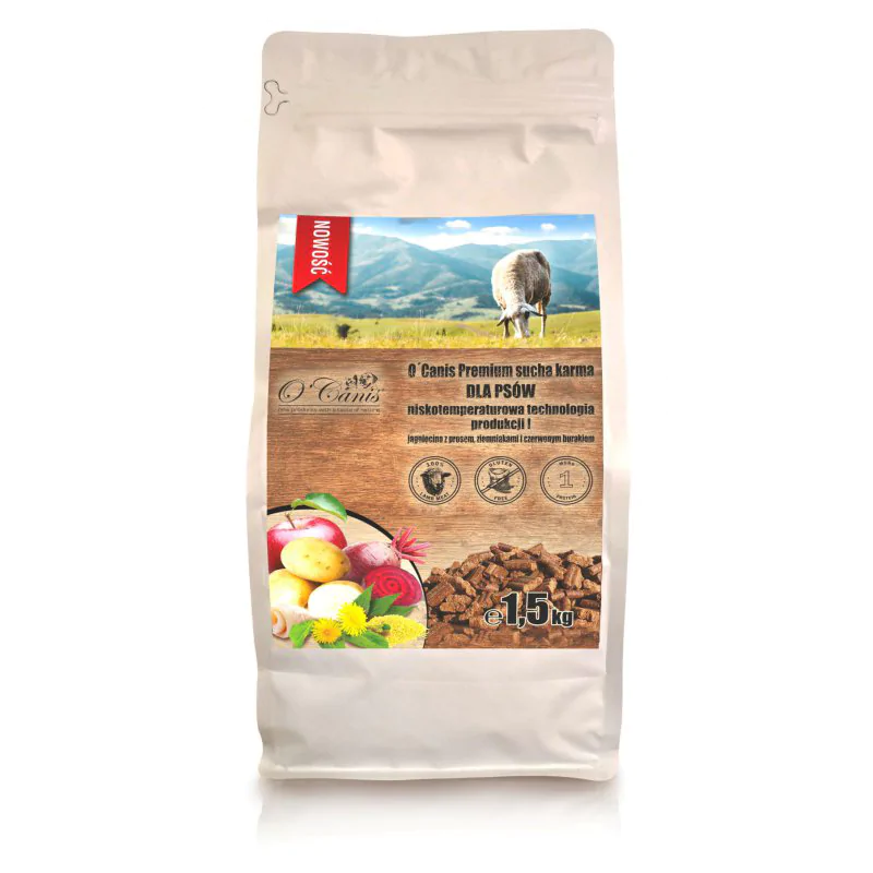 O’Canis Jagnięcina z prosem to wysokiej jakości, pełnoporcjowa karma sucha dla dorosłych psów wszystkich ras, przygotowana w unikalnym procesie tłoczenia na zimno. Dzięki tej metodzie produkcji karma zachowuje naturalne wartości odżywcze, a jednocześnie jest łatwiej strawna i delikatniejsza dla układu pokarmowego niż klasyczne karmy ekstrudowane.