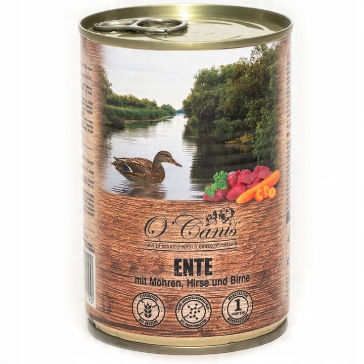 O’Canis Kaczka z marchewką to pełnoporcjowa, naturalna mokra karma dla psów wszystkich ras, oparta na wysokiej zawartości mięsa kaczki oraz lekkostrawnej marchewce. Receptura została opracowana tak, aby spełniać potrzeby psów z wrażliwym układem pokarmowym, alergiami lub nietolerancjami pokarmowymi.