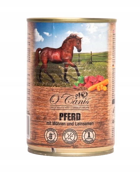 O’Canis Koń z siemieniem lnianym i marchewką to wysokiej jakości mokra karma dla dorosłych psów wszystkich ras, szczególnie polecana alergikom oraz psom z delikatnym układem pokarmowym. Zawiera aż 90% mięsa i podrobów z koniny – rzadkiego, hipoalergicznego źródła białka, które doskonale sprawdza się w diecie eliminacyjnej.