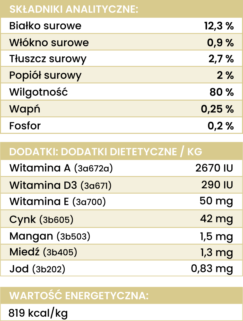 białko surowe 12,3%, tłuszcz surowy 2,7%, popiół surowy 2%, włókno surowe 0,9%, wilgotność 80%, wapń 0,25%, fosfor 0,2%.