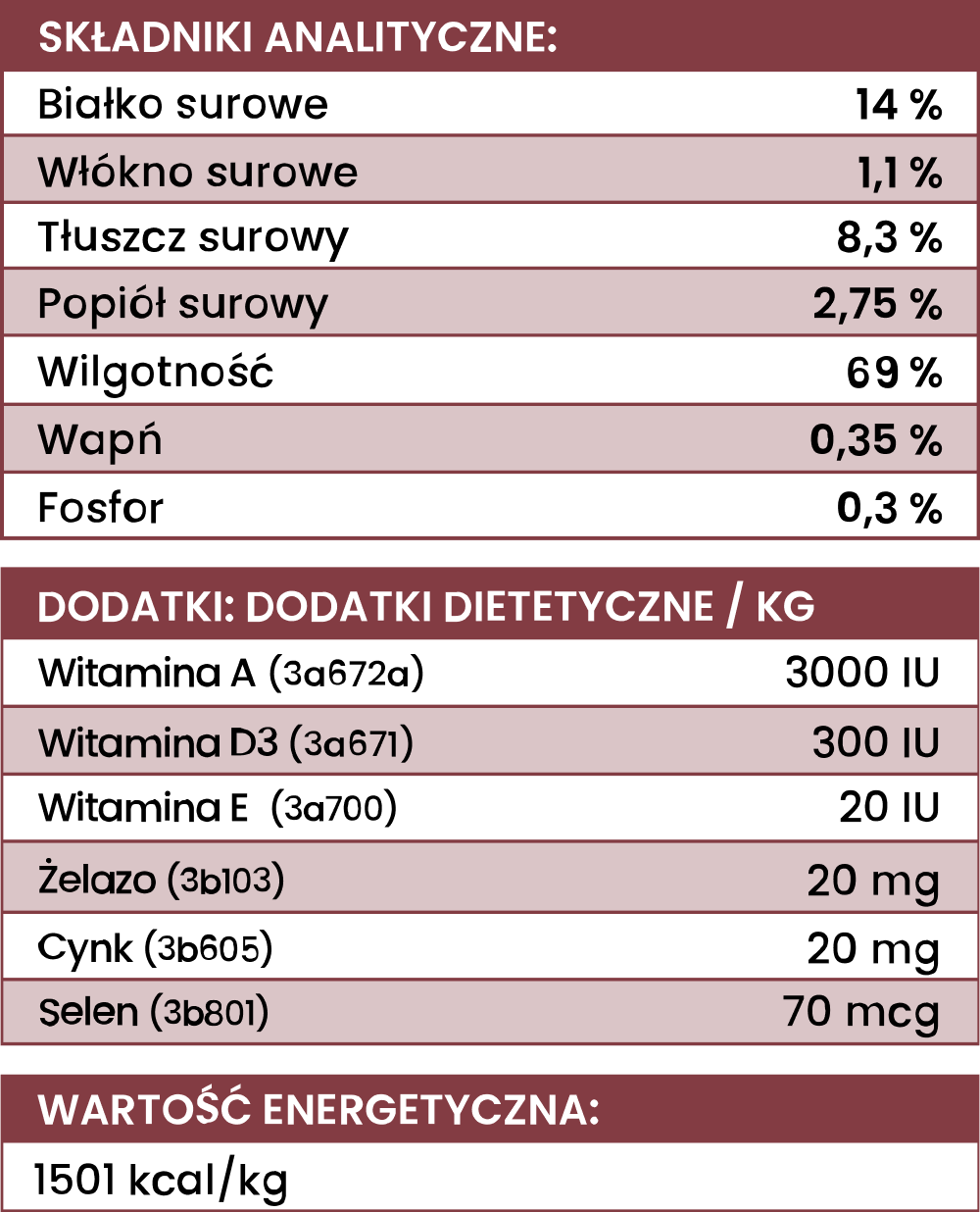 Białko surowe: 11,2%, tłuszcz surowy: 4,9%, popiół surowy: 1,3%, włókno surowe: 0,5%, wilgotność: 79,3%