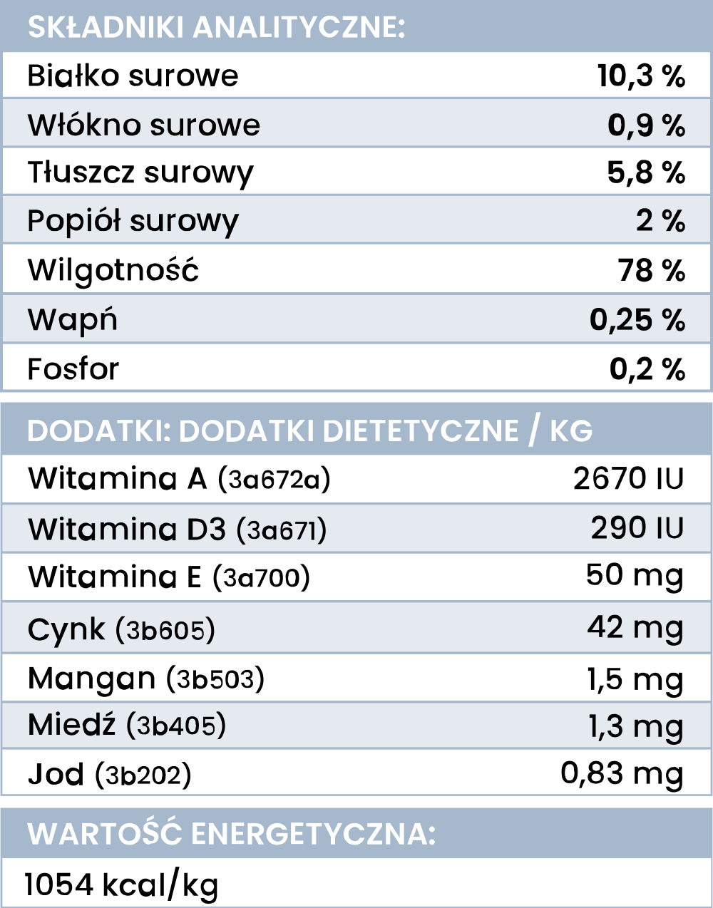 Białko: 10,1%, Tłuszcz: 7,6%, Włókno surowe: 0,9%, Popiół surowy: 2%, Wilgotność: 73%,
