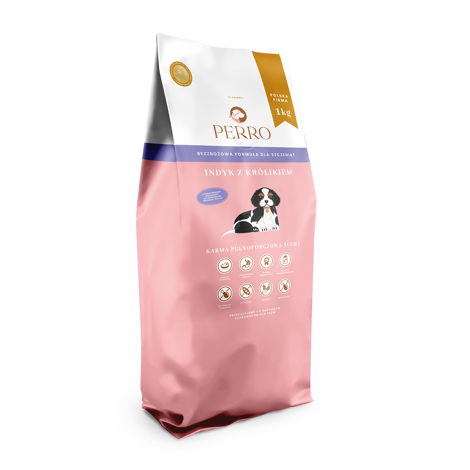 PERRO Junior Indyk z Królikiem i Batatami to specjalistyczna, bezzbożowa sucha karma stworzona z myślą o harmonijnym wzroście i rozwoju szczeniąt, ze szczególnym uwzględnieniem potrzeb ras średnich i dużych. Formuła oparta na dwóch delikatnych źródłach białka – indyku i króliku – oraz lekkostrawnych batatach, wsparta jest kompleksem składników aktywnych dla zdrowia stawów, trawienia i odporności rosnącego psa.
