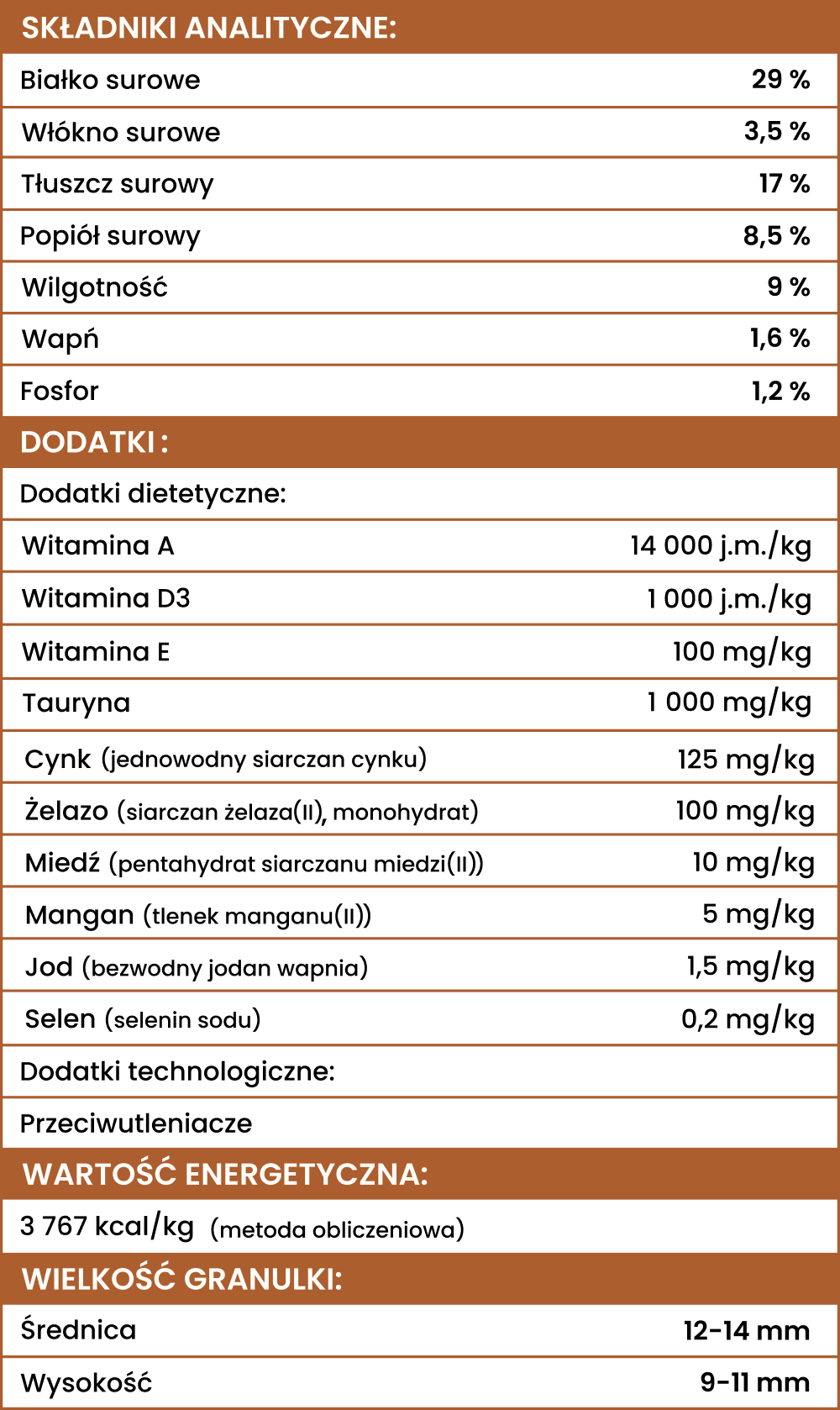 29% białka, 3,5% włókna, 17% tłuszczu, 8,5% popiołu, 9% wilgotności, 1,6% wapnia, 1,2% fosforu.