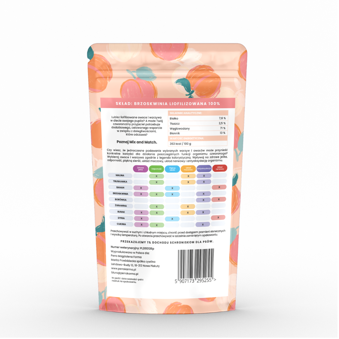 PERRO MIX & MATCH Brzoskwinia to 100% naturalny, liofilizowany owoc, pozbawiony pestki i skórki. Soczysta i lekka forma tej przekąski sprawia, że jest odpowiednia zarówno dla psów, jak i kotów. Stanowi źródło nawilżenia oraz składników wspierających zdrowie skóry i naturalną odporność, będąc doskonałym elementem koncepcji spersonalizowanego żywienia MIX & MATCH.