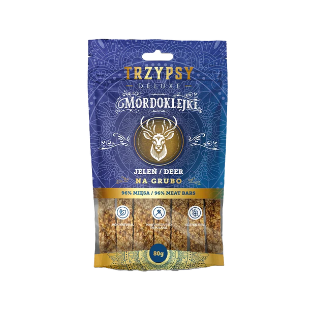Trzypsy Mordoklejki to w pełni naturalne gryzaki dla psów w formie półmiękkich batonów o długości ok. 10 cm. Wykonane z 96% mięsa jelenia i 4% kolagenu, oferują nie tylko wyjątkowy, dziczy smak, ale też realne wsparcie higieny jamy ustnej i stawów. To czysty, bezglutenowy przysmak bez sztucznych dodatków, który skutecznie łączy przyjemność z funkcjonalnością.
