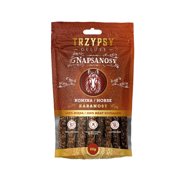 Twój pies zasługuje na prawdziwe, naturalne smakołyki! Trzypsy Napsanosy z mięsa koniny to doskonała przekąska dla psów, które cenią sobie pełnię smaku i zdrowia. Wykonane w 100% z mięsa koni, kabanosy są zdrową, wysokobiałkową opcją, która dostarcza psu niezbędnych składników odżywczych i prawdziwej przyjemności.