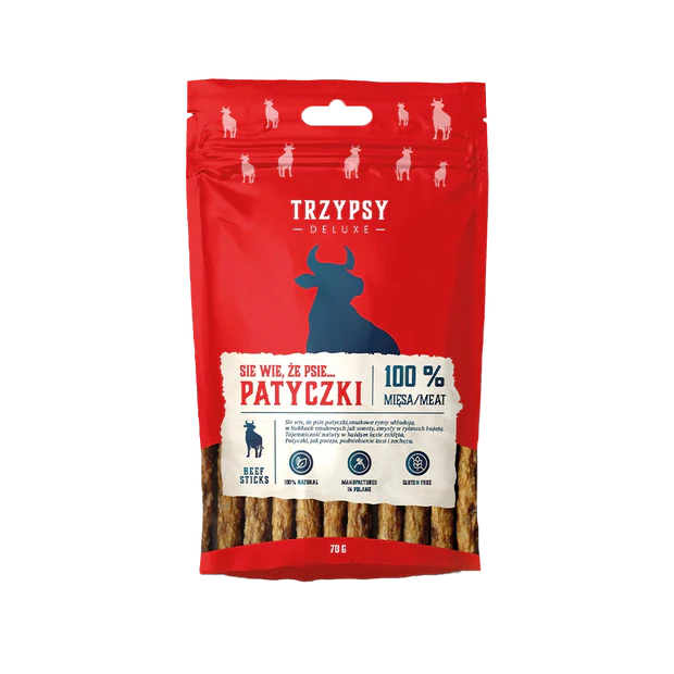 TRZYPSY DELUXE sie wie, że psie… patyczki z wołowiny to w pełni naturalne, miękkie przysmaki dla psów, wyprodukowane w 100% z mięsa wołowego w poręcznej formie patyczków. Jeden patyczek ma około 11,5 cm długości i jest bardzo łatwy do podzielenia. To czysty, pozbawiony zbędnych dodatków smakołyk o wyjątkowym aromacie, idealny jako nagroda lub uzupełnienie codziennej diety.