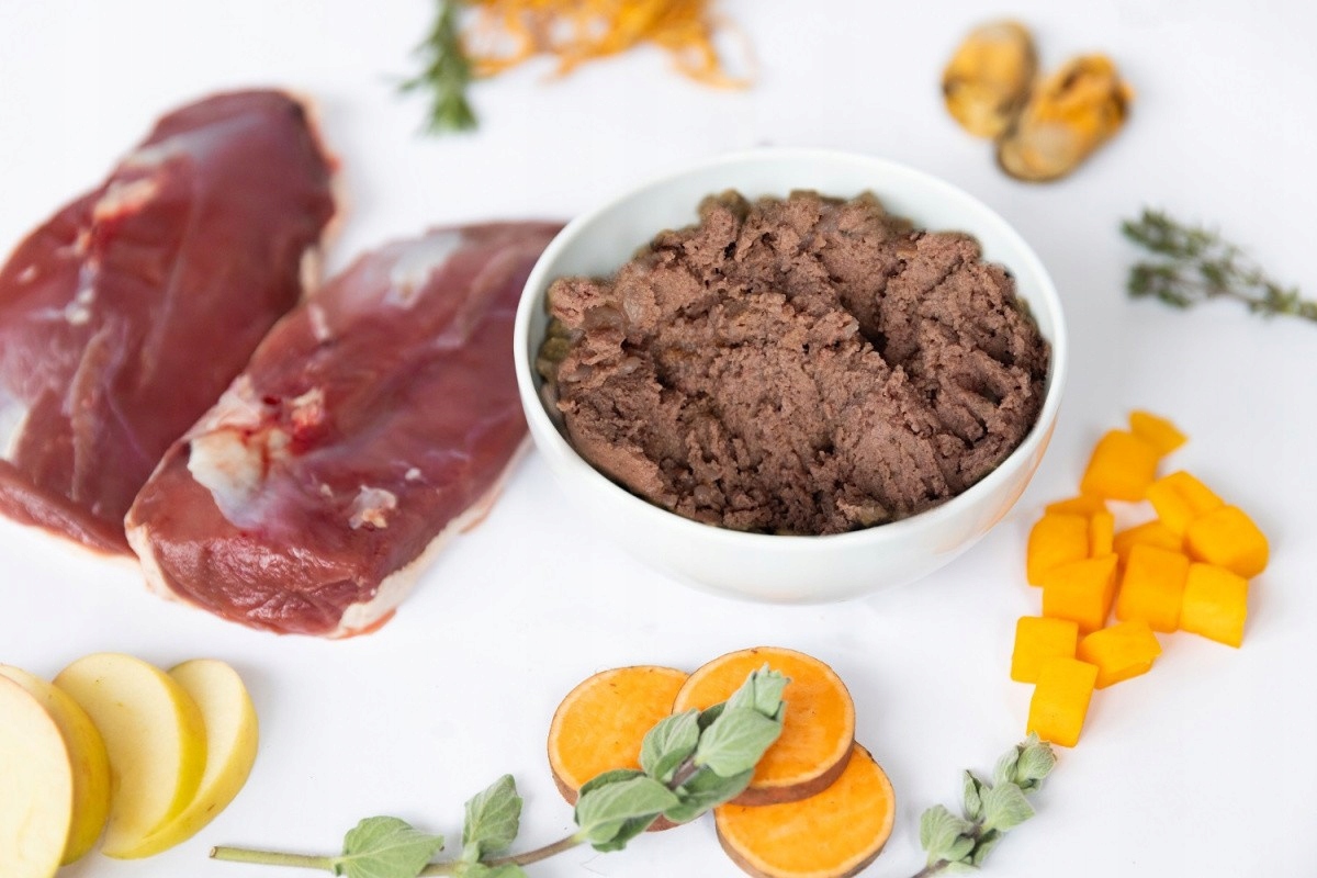 90% świeża kaczka (70% mięso, 20% podroby), bataty, mieszanka prozdrowotna (banan, karczoch, cykoria, lucerna, jabłka, dynia, żurawina, małża zielonowargowa, zioła), olej z pstrąga, glukozamina, chondroityna, MSM.